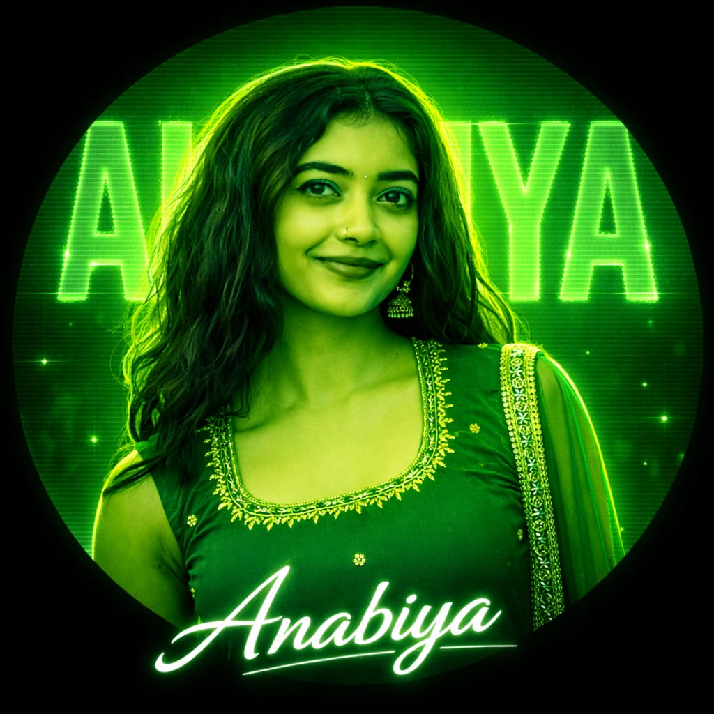 PROMPT:- Round profile DP of me ( Uploaded Reference image) and please keep the same face, same texture, same outfit, same pose, same facial expressions. And deep dark green + neon mehndi green monochrome look, high contrast, glowing neon light. Background with large translucent “ANABIYA” text and subtle CRT scanline effect. Bottom stylish white text “ANABIYA”. Digital fan-art style.