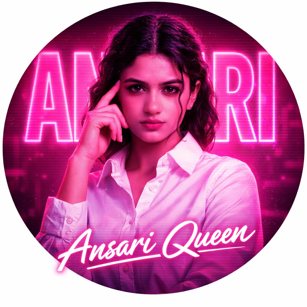 PROMPT:- Round profile DP of me ( Uploaded Reference image) and please keep the same face, same texture, in a white button-down shirt, serious camera-facing pose, right hand touching temple. Deep pink + neon magenta monochrome look, high contrast, glowing neon light. Background with large translucent “ANSARI” text and subtle CRT scanline effect. Bottom stylish white text “ANSARI QUEEN”. Digital fan-art style, and I repeat keep the exactly same face as in the reference image no alteration.