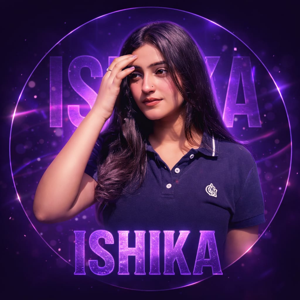 PROMPT:- Use uploaded photo as exact face (identity lock). High-detail aesthetic circular profile DP, purple neon color grade, cinematic lighting, soft glow, smooth retouch, sharp face focus. Purple blurred background with light streaks/particles. Large transparent “ISHIKA” text behind subject, bold texture styles “ISHIKA” text at bottom, high contrast, ultra-realistic, 4K, centered, pro color grade, pls keep the face same, same texture, same outfit, same pose, same facial expressions, no alteration.