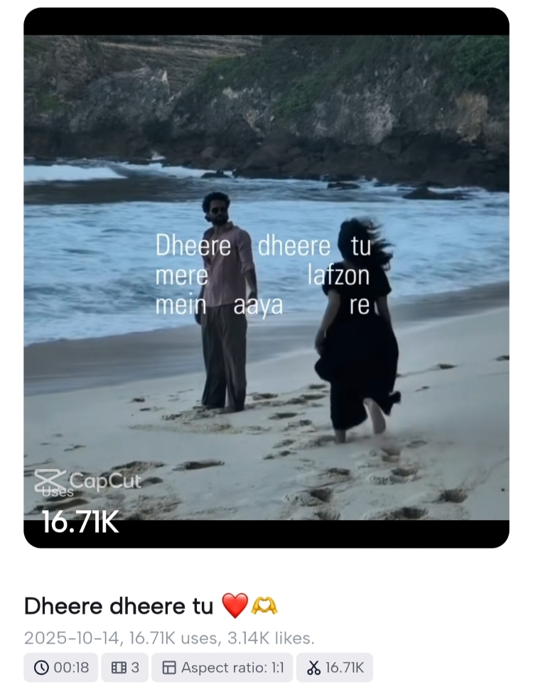 The “Dheere Dheere Tu Mere Lafzon Mein Aaya Re” CapCut template is more than just a trend—it’s a celebration of emotion, creativity, and connection. Whether you’re a seasoned content creator or just starting out, this template offers a beautiful way to express your story.So go ahead—choose your favorite photos, let the music guide your edits, and share your heart with the world. Because sometimes, the quietest words speak the loudest.