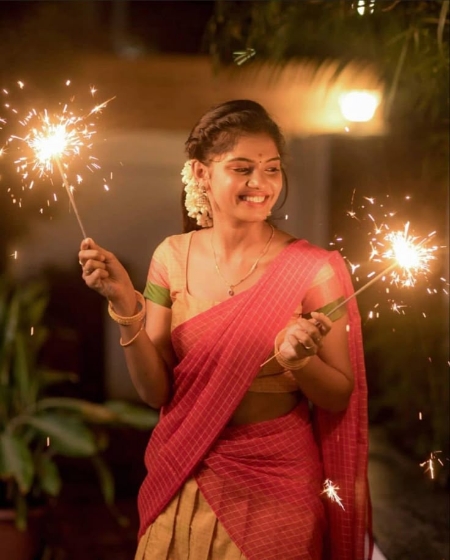 PROMPT:- Use 100% my face exactly from the image. generate a high realistic DSLR-Quality resolution, high angle from top, wide photography of a young woman have golden and burgundy wavy long hair and her luxurious makeup accentuates her atmosphere Create a Diwali picture where a girl is lighting a phuljhari and various types of firecrackers are bursting next to her, illuminated by the light.. blouse and a pink shifon saree with golden border. 100%match my face