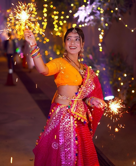 PROMPT:- “A joyful and energetic young Indian woman, dressed in a festive pink and gold lehenga choli with a vibrant orange blouse, holds two lit sparklers aloft. She is adorned with colorful bangles, traditional earrings, a maang tikka, and an ornate waist belt. Her head is tilted back slightly as she smiles broadly. The background features blurred, warm fairy lights creating a magical bokeh effect, suggesting an outdoor evening celebration, and please keep the face 100% same as in the reference image no alteration.”