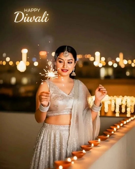 PROMPT:- An attractive young Indian woman, dressed in a beautiful silver lehenga and traditional jewelry, stands on a balcony at night holding a lit sparkler. Her face is illuminated by the sparkler’s glow, and she is smiling warmly. In the foreground, a row of traditional diyas cast a soft, inviting light. Her face should be exactly as we uploaded the photo. In the background is a hazy cityscape with twinkling lights, creating a festive and joyous atmosphere. ‘Happy Diwali’ is written in the upper left corner.