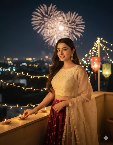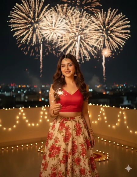 PROMPT:- Ultra-realistic 8K DSLR festive portrait of the same young Indian woman (face and hairstyle must remain exactly the same as reference, no changes). She is wearing the same red stylish blouse and cream lehenga with red floral prints, adorned with bangles and earrings. She is standing gracefully on a festive terrace, holding a lit sparkler (phuljhari) in her hand, her eyes glowing with joy as she smiles at the camera. The background glows with fireworks in the sky, fairy lights on the walls, and diyas placed along the ledge. Cinematic shallow depth of field, warm golden festive tones, professional DSLR sharpness.
