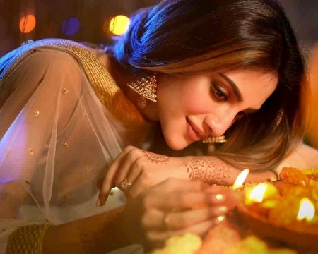PROMPT:- “Create a realistic portrait of ME (uploaded image) with warm hair and intricate mehndi on her hand, adorned with traditional gold jhumka earrings, gently lights a diya lamp. She is wearing a delicate white and gold traditional outfit. Her expression is soft and serene as she looks down at the flame. The background is softly blurred with warm, colorful bokeh lights, creating an intimate and festive atmosphere, and please keep the face 100% same as in the reference image no alteration.”