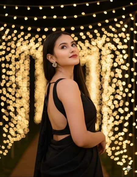 PROMPT:- “A stunning young woman with long, dark hair, wearing a stylish backless black blouse and a black saree. She is looking over her shoulder with a captivating gaze. The background is filled with warm, out-of-focus golden string lights, creating a beautiful bokeh effect and a festive, elegant atmosphere, and please keep the face 100% same as in the reference image no alteration.”