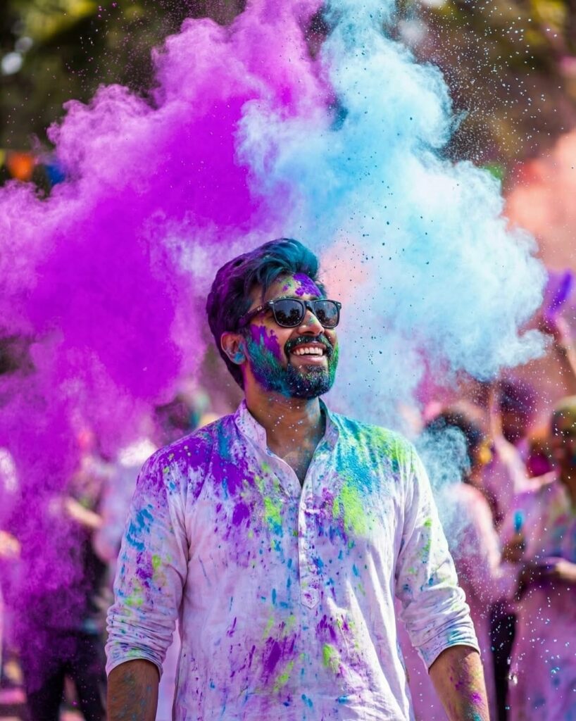 PROMPT:- Dynamic action portrait of a young man smiling joyfully, capturing the pure festive energy of Holi. A massive, high-contrast cloud of neon purple and sky-blue powder explodes dramatically in the background and foreground. He wears a crisp white kurta and sunglasses, heavily splattered with colorful pigment. Glistening water droplets and vibrant powder particles are captured frozen mid-air using high-speed photography. Candid, radiant, bright natural sunlight illuminating the dust cloud, ultra-detailed, highly textured.