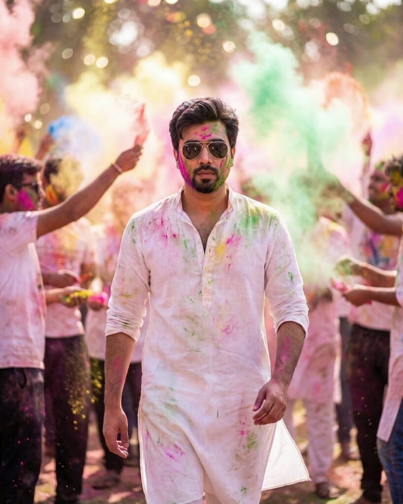 PROMPT:- A cinematic, slow-motion style medium shot of Me ( Uploaded Reference image) walking confidently through a chaotic Holi crowd toward the camera. He wears stylish aviator sunglasses and a white linen kurta flowing behind him, both heavily dusted with multi-colored powder. People around him are throwing color, but he is in sharp focus, looking cool and composed. Shallow depth of field, bokeh effect, and please keep the face same as in the reference image no alteration.”