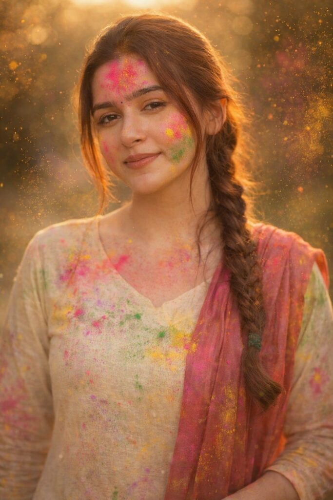 PROMPT:- Use the uploaded female reference image as the single and exclusive facial identity reference (absolute face lock).Create a photorealistic waist-up portrait of her celebrating Holi festival outdoors.Scene & moodWarm golden hour sunlight with soft cinematic glowShallow depth of field with creamy bokeh and floating color powder particles in the airNatural candid expression, gentle soft smile, looking directly at cameraAppearance & detailsPreserve exact facial features, proportions, skin texture, eyes, nose, lips, jawline, and hair exactly as referenceLight natural makeup only (no beautification no stylization, no face alteration, keep the face same as in the reference image)Wearing a simple off-white/cream kurti and pink silk DupattColor elementsRealistic Holi powder (pink, yellow, green) lightly smeared on cheeks, forehead, and scattered across clothingFine color dust particles catching sunlight for a dreamy atmosphereCamera & style85mm portrait lens lookUltra-realistic photography, high dynamic rangeNatural skin tones, soft contrast, cinematic color.