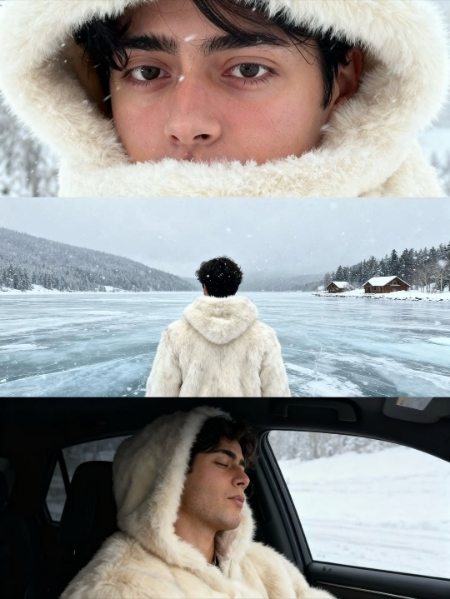 PROMPT:- Create a realistic Winter snowfall 3 layer photo of me ( uploaded selfie ) here is the image description,Top Image (Close-up Portrait):Subject: A person’s face (eyes and nose prominently visible), partially obscured by a furry hood.Expression: A neutral or slightly contemplative expression, conveying a sense of being exposed to the cold but serene.Attire: A very fluffy, cream-colored or off-white fur-lined hood, pulled snugly around the face, covering the chin and mouth area. The fur texture should be very soft and inviting.Setting: Blurry, out-of-focus background of falling snow and possibly distant snow-covered trees.Lighting: Soft, diffused natural light, typical of an overcast snowy day, highlighting the subject’s features and the fur’s texture.Details: Visible snowflakes on the fur or eyelashes, a slight flush on the cheeks due to the cold, and clear, expressive eyes.Middle Image (Back View, Landscape):Subject: A person from behind, wearing a prominent, cream-colored, fluffy fur coat or parka with a hood. The hood is up.Pose: Standing still, looking out over a vast, frozen body of water (like a lake or a large river) covered in ice and a light dusting of snow.Setting:Foreground/Midground: Expansive, reflective ice surface with subtle cracks or textures, suggesting its frozen state. Light snow is falling, creating a sense of depth and atmosphere.Background: A dense line of snow-covered evergreen trees (pines or firs) stretching across the horizon, slightly blurred. In the far distance, on the edge of the tree line, a small, rustic wooden cabin or two with snow on their roofs.Atmosphere: Cold, serene, vast, and slightly melancholic. The falling snow adds to the tranquility.Lighting: Soft, even light, consistent with an overcast winter day.Bottom Image (Side Profile, Indoor/Car Setting):Subject: A person in a car, seen from the side profile (upper torso and head). They are wearing the same cream-colored, fluffy fur-lined hood, which is up.Pose: Eyes closed or looking down, appearing to be resting, sleeping, or lost in thought. A calm and peaceful expression.Setting: Inside a car, with the dashboard or car interior subtly visible in the foreground/midground. Through the window, a blurry, out-of-focus snowy landscape is visible, indicating they are still in a winter environment.Lighting: Softer, perhaps slightly warmer interior lighting contrasted with the cool light from outside, creating a cozy yet wintery feel.Details: The texture of the fur hood is again prominent, suggesting warmth and comfort.Overall Style and Mood:Color Palette: Predominantly cool tones (blues, grays, whites) for the outdoor scenes, with the warmth of the fur providing a contrast.Photography Style: Cinematic, natural, with a focus on capturing authentic moments and textures. A slight depth of field in each image to draw attention to the subject while providing context.Emotion: A journey through a winter landscape, from experiencing the cold directly, to contemplating its vastness, to finding a moment of peaceful rest.