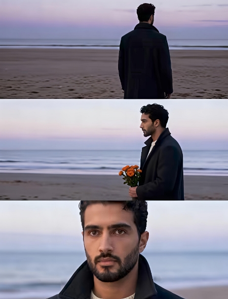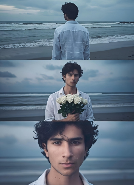PROMPT:- Prompt: Create a vertical frame(2160×3840 pixels, 4K quality). divided into three equal horizontal segments forming a cinematic photo strip. The scene follows a young male character inspired by the reference image – same hairstyle, facial structure, and gentle yet expressiv epresence. The mood should radiate nostalgia, melancholy, and soft emotional depth.Overall Mood & Color Palette: Cold and muted tones with a slight blue-gray tint, gentle natural lighting (early dawn or twilight). The background should evoke loneliness,calm, and reflection. Soft focus and bokeh effects to enhance emotional realism.Image 1 (Top – Rear View Portrait): The character stands at the edge of a vast sea shore, facing the ocean, wearing a loose white shirt fluttering in the breeze. The sea stretches endlessly with soft waves under a pale sky. His posture reflects peace mixed with sorrow – shoulders slightly lowered. The scene feels cinematic, with a shallow depth o ffield and cool tones. Image 2 (Middle – Medium Shot): The character holds a small bouquet of white roses close to his chest,looking down thought fully. The sea and sand form the back drop, slightly blurred. His expression conveys quiet sadness and longing,illuminated by soft ambient light.Gentle mist or faint fog adds atmosphere.Image 3 (Bottom – Close-Up):A close-up of his face, eyesreflecting emotion – deep, sorrowful, yet calm. The focus is on his eyes and subtle facial features, with the sea still visible in the blurred background. Every detail, from the soft lighting to the wind tousling his hair, empha sizes aserene, emotional narrative.Composition Style: Cinematic, moody, natural lighting,shallow depth of field, filmic texture,bokeh background, color grading in cool tones (bluish-gray).Use a photo realistic style with emotional story telling similar to a still frame from an indie film. And don’t change the face, i want 100% same face as in the reference image no alteration.”