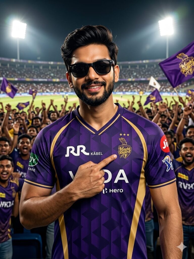 PROMPT:- Use my Face from ( uploaded reference image) he is me wearing black sünglasses and a confident smile. And the jersey photo that I uploaded as in the second one, he should be wearing that very same jersey in it. He is pointing his finger at the KKR logo on his chest. The background is a packed cricket stadium at night, with a cheering crowd waving flags and making the subject appear powerful and enthusiastic, with the blurred crowd. And please keep the face same as in the reference image no alteration. Negative Prompt:- cartoon, illustration, 3D render, over-sharpened, high contrast, smooth skin, plastic texture, unnatural face.