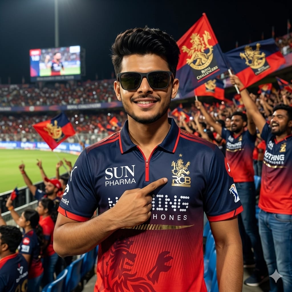 PROMPT:- Use my Face from ( uploaded reference image) he is me wearing black sünglasses and a confident smile. And the jersey photo that I uploaded as in the second one, he should be wearing that very same jersey in it. He is pointing his finger at the RCB logo on his chest. The background is a packed cricket stadium at night, with a cheering crowd waving flags and making the subject appear powerful and enthusiastic, with the blurred crowd. And please keep the face same as in the reference image no alteration. Negative Prompt:- cartoon, illustration, 3D render, over-sharpened, high contrast, smooth skin, plastic texture, unnatural face.