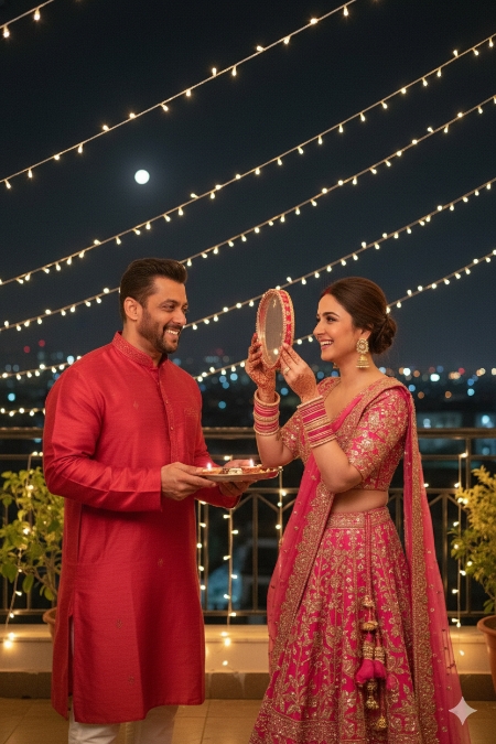 PROMPT:- “A couple celebrating Karwa Chauth on a rooftop at night. The woman, dressed in a vibrant pink traditional outfit, is looking at her husband through a sieve. The man, wearing a red shirt, is looking back at her with a smile. String lights and a small moon are visible in the background, adding a festive glow to the night sky, keep the face 100% same as in the reference no alteration.”