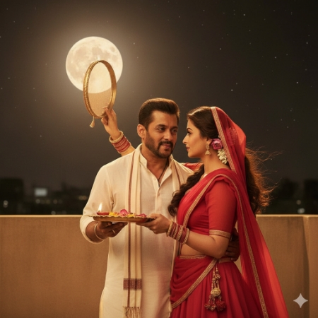 PROMPT:- A high-quality, cinematic shot of a young, stylish Indian couple celebrating Karwa Chauth on a luxurious, royal-looking terrace at night. The man, wearing a royal-style kurta pajama, is holding a rich-looking Karwa Chauth thali with a lit diya and laddoo. He looks at the woman with a graceful, romantic expression full of love and admiration. The woman, wearing an ornate traditional gold-sequined red lehanga, with mehandi on her hands and intricate 90s-style gold jewelry including a choker, earrings, and bangles, stands beside him in an elegant Indian worship pose (A) while gazing towards the full moon her eyes close. Her hair is styled as dark brown, long wavy-curly with a small gajra tucked in for a romantic touch. The scene is lit with warm golden light, casting dramatic shadows for a moody, vintage cinematic effect. The background features a textured royal wall and a glowing full moon in the night sky, creating a rich, devotional yet romantic festive atmosphere. The final image should preserve their original facial features while giving a graceful, romantic Karwa Chauth look.