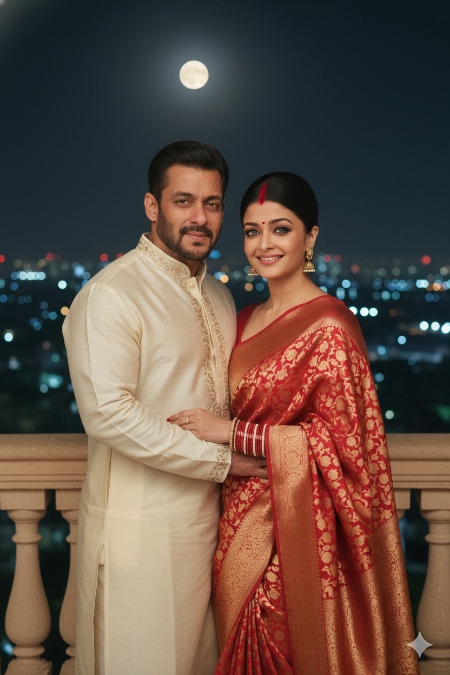 PROMPT:- “A smiling Indian couple standing closely together on a balcony at night, with a city skyline and a full moon in the background. The man is wearing a cream or off-white embroidered kurta. The woman is wearing a beautiful red and gold traditional saree with intricate patterns, red and white bangles, and has sindoor in her hair. Both are looking directly at the camera with warm smiles, and keep the face 100% same as in the reference image no alteration.”