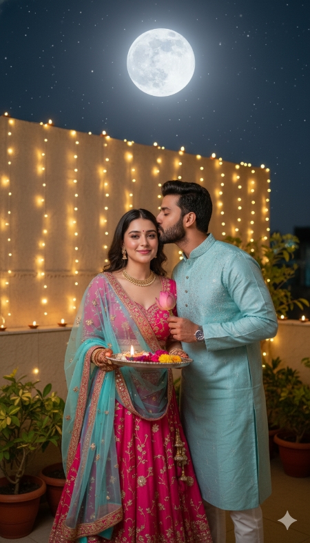PROMPT:- Create a hyper-realistic photo of a romantic Indian couple celebrating Karva Chauth.Very Important:Use the reference photo of the girl (uploaded) and make her face 100% EXACTLY the same as in the reference photo, with no changes in features, skin tone, or expression.Use the reference photo of the boy (uploaded) and make his face 100% EXACTLY the same as in the reference photo, with no changes in features, skin tone, or expression.Both faces must match the references perfectly, with zero distortion.Scene details:The couple should be standing together under a bright full moon at night.The girl is wearing a traditional lehenga with a pink blouse and sky-blue dupatta with golden embroidery.She is holding a decorated thali with a lit diya (lamp) and flowers.The boy is standing very close to her, wearing a light blue kurta pajama.He should be kissing the girl gently on her cheek while holding a lotus flower in one hand.Background should have warm festive lighting with fairy lights and an Indian-style terrace decoration, creating a romantic Karva Chauth atmosphere.The entire photo should look cinematic, vibrant, and realistic with natural light.STRICT RULE:Do not change or alter the girl’s or boy’s face in any way.Their faces must be 100% identical to the reference photos, with exact features and proportions.