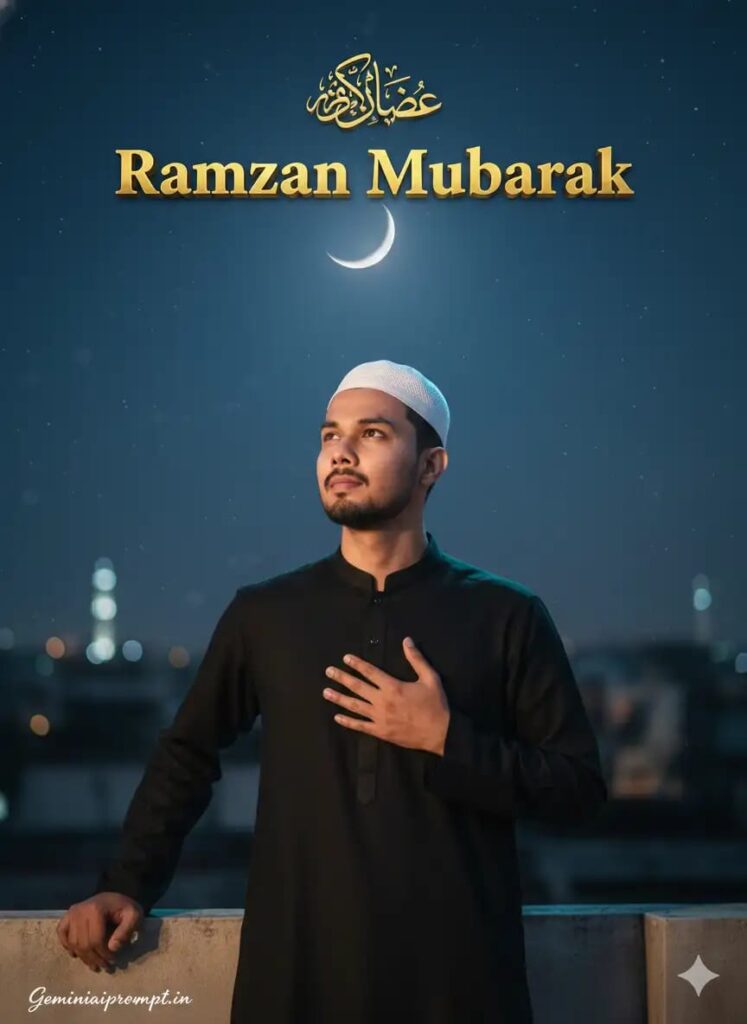 PROMPT:- IMPORTANT – FACE LOCK (STRICT – NO CHANGE) Use uploaded reference image. Face must remain identical 100%. Do NOT alter: Facial bone structure Eye spacing Beard density Skin texture Natural asymmetry Expression No beautification. No reshaping. No AI smoothing. No sunglasses. Preserve authentic human skin with realistic light interaction. STYLE & QUALITY Ultra-realistic cinematic DSLR night photography. Hyper-detailed skin. Sharp focus. 0% blur. No CGI appearance. SCENE Ramadan rooftop reflection moment after Maghrib. BACKGROUND DETAILS Dark blue gradient night sky. Bright delicate crescent moon centered upper frame. Soft glowing mosque minarets far behind. Subtle atmospheric haze. City lights twinkling softly. Clean rooftop edge visible. OUTFIT DETAILS Deep charcoal black kurta. Full sleeves. Minimal traditional stitching. White taqiyah cap. Matte natural fabric texture. POSE DETAILS Standing calmly with one hand resting on rooftop boundary wall. Other hand placed over chest. Body slightly angled toward camera. Head turned upward toward moon. EXPRESSION DETAILS Gentle serene expression. Soft spiritual eyes reflecting moonlight. Subtle emotional gratitude. Natural relaxed mouth. LIGHTING Cool moonlight creating soft rim light on hairline and shoulders. Warm terrace lamp glow from below creating balanced contrast. No artificial highlights. Realistic night exposure. CAMERA & COMPOSITION Waist-up portrait. Eye-level angle. Moon placed above subject’s shoulder line. Cinematic depth. Ultra HD clarity. TEXT DETAILS Top Arabic elegant calligraphy. Below in bold cinematic 3D metallic gold: “Ramzan Mubarak” High contrast embossed finish. Soft luminous glow. Premium festive Islamic typography. TEXT / SIGNATURE Add “GhausEditz” at the bottom-left corner, HANDWRITTEN SIGNATURE-STYLE typography, thin cursive strokes, small size, subtle premium elegance, white or soft off-white color. ASPECT RATIO • 3:4 vertical NEGATIVE PROMPT AI look, cartoon, painting style, blur, depth blur, plastic skin, low quality, distorted face, oversaturated gold, watermark (except signature), noise, artificial glow.