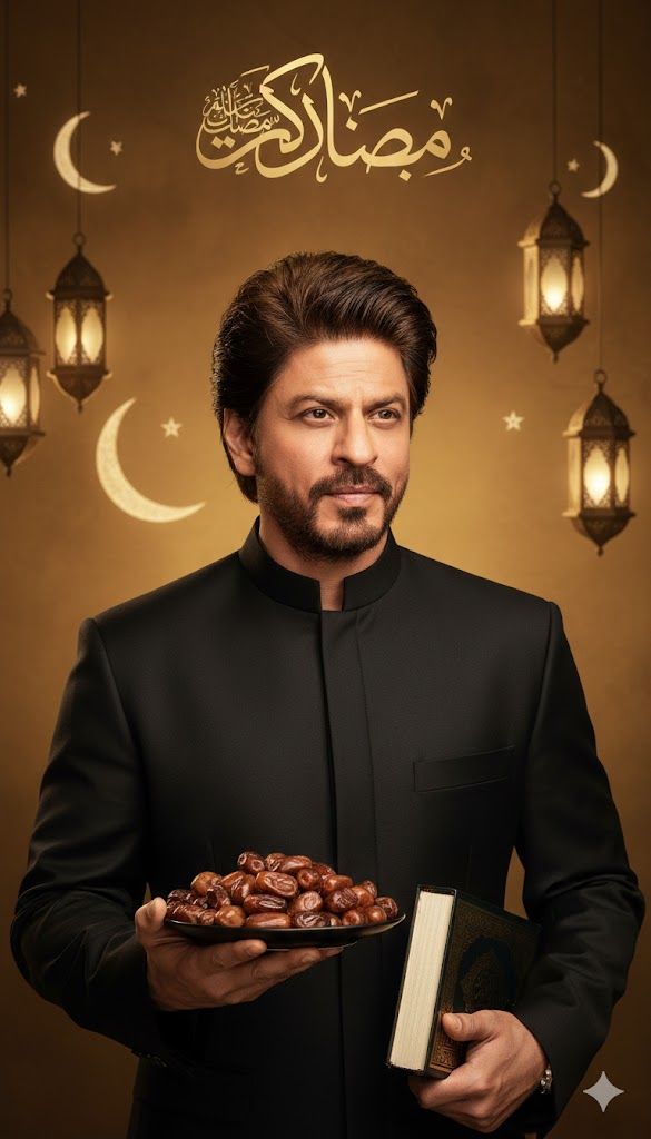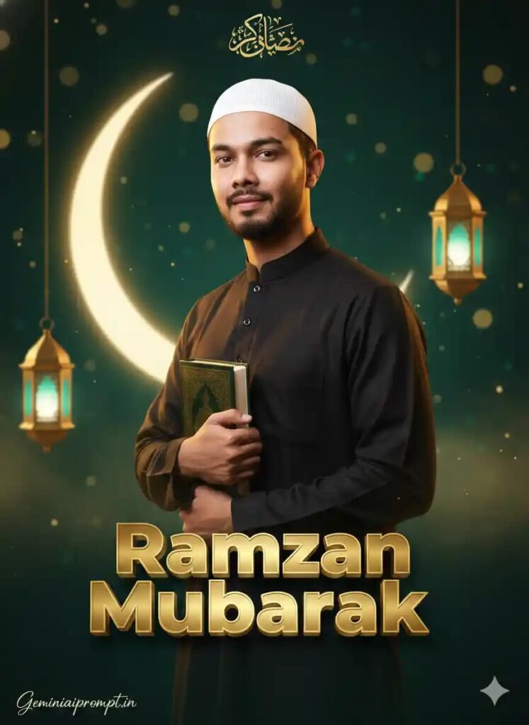 PROMPT:- “A high-quality cinematic portrait of me [Uploaded Reference image] wearing a sophisticated black Nehru jacket. He is holding a small plate of dates in one hand and a decorative holy book (Quraan Sharif) in the other. The background is a warm, golden-brown gradient decorated with hanging glowing lanterns, crescent moons, and stars. Above him, elegant gold Arabic calligraphy reads ”Ramadan Kareem”. Soft, professional studio lighting with a festive, spiritual atmosphere. And i want 100% same face as in the reference image no alteration.”