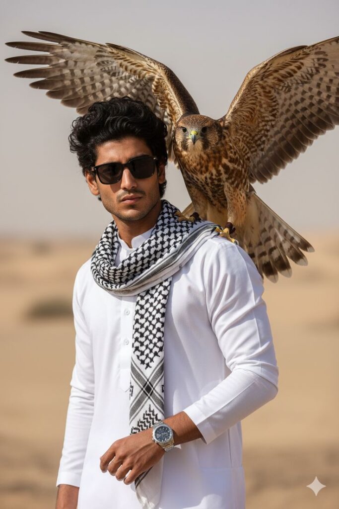 PROMPT:- “Use uploaded photo as exact face (identity lock). Standing in a desert environment, wearing a clean white kandura/thobe and a black-and-white keffiyeh scarf around the neck. Black modern sunglasses, luxury silver wristwatch visible. A large falcon perched confidently on his shoulder with wings fully spread wide. Falcon detailed feathers, sharp eyes, realistic texture. Desert background with soft sand dunes, warm golden daylight, natural sunlight, shallow depth of field, background slightly blurred. Cinematic photography, ultra-realistic, sharp focus on face, high detail skin texture, professional color grading, 85mm lens, DSLR quality, dramatic composition, editorial fashion style, 4K resolution, high contrast, natural shadows, symmetrical wing spread, powerful and royal vibe. And pls keep the face same as in the reference image, I want 100% same face no changing”