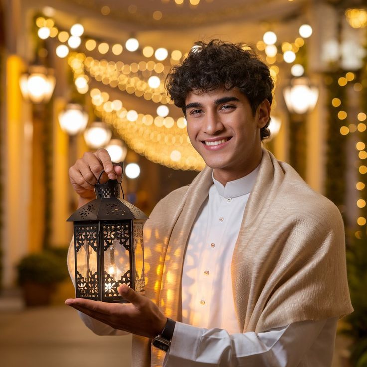 PROMPT:- Use uploaded photo as exact face (identity lock).Ultra-realistic cinematic portrait of me while holding a decorative black metal lantern with glowing candle light inside. He is wearing a white traditional kurta with a soft beige shawl draped over his shoulders. Evening festive ambiance with warm golden fairy lights and street lamps in the background, strong bokeh effect, shallow depth of field. Soft warm lighting illuminating the face, natural skin texture, sharp focus on face and lantern, background blurred with golden light trails. Festive celebration mood, elegant traditional look, luxury atmosphere. DSLR quality, 85mm lens, f/1.8 aperture, high detail, ultra realistic, 4K resolution, cinematic color grading, warm tones, soft glow, professional photography, centered composition. And don’t change my face, I want 100% same face as in the reference image no alteration.”