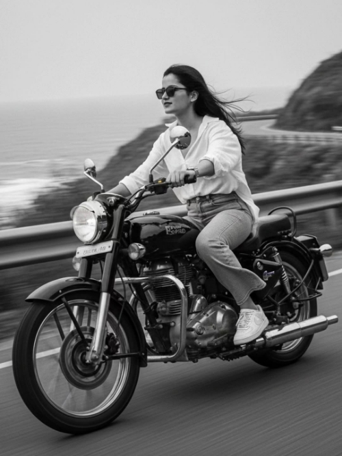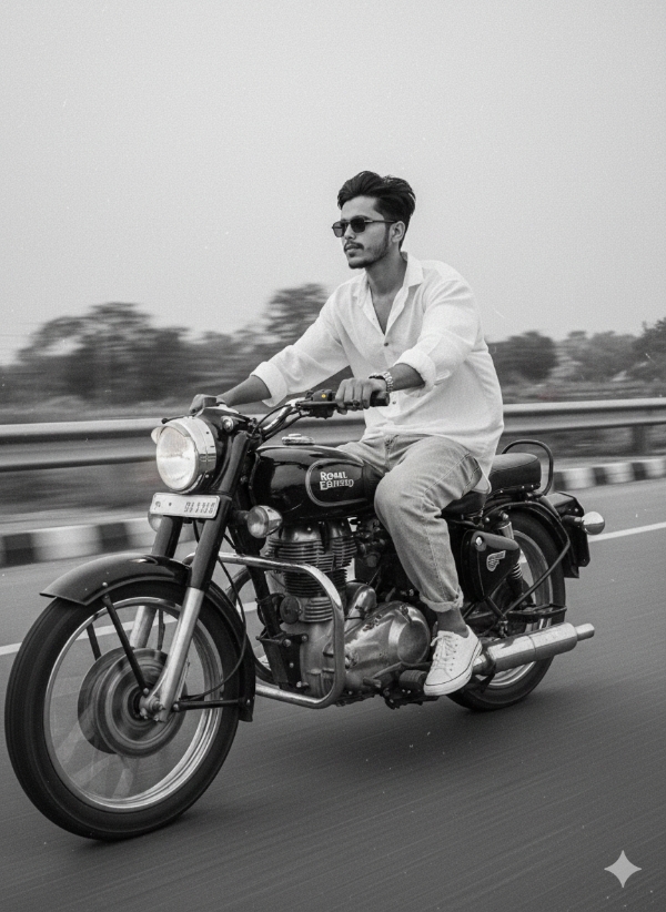 PROMPT FOR GIRLS:- “Slim-fit 5’7 young woman riding her black Royal Enfield Bullet 350, glancing confidently to the side, hands on the handlebars, leaning naturally into the ride. SHe’s wearing an oversized white linen shirt with the top buttons open, light blue baggy jeans, and clean white sneakers. A silver wristwatch shines subtly on his wrist, and narrow-frame rectangular classy sunglasses complete her look. Her face is fully visible – preserve 100% face, I want 100% same face as in the uploaded image no alteration. The photo features a vintage cinematic grain aesthetic with Leica M11 Monochrome black-and-white tones, enhanced with a motion blur effect to convey speed and dynamic movement.”