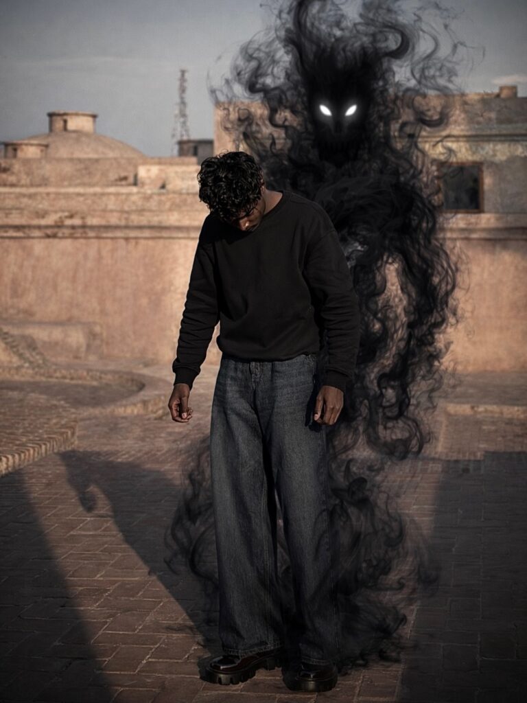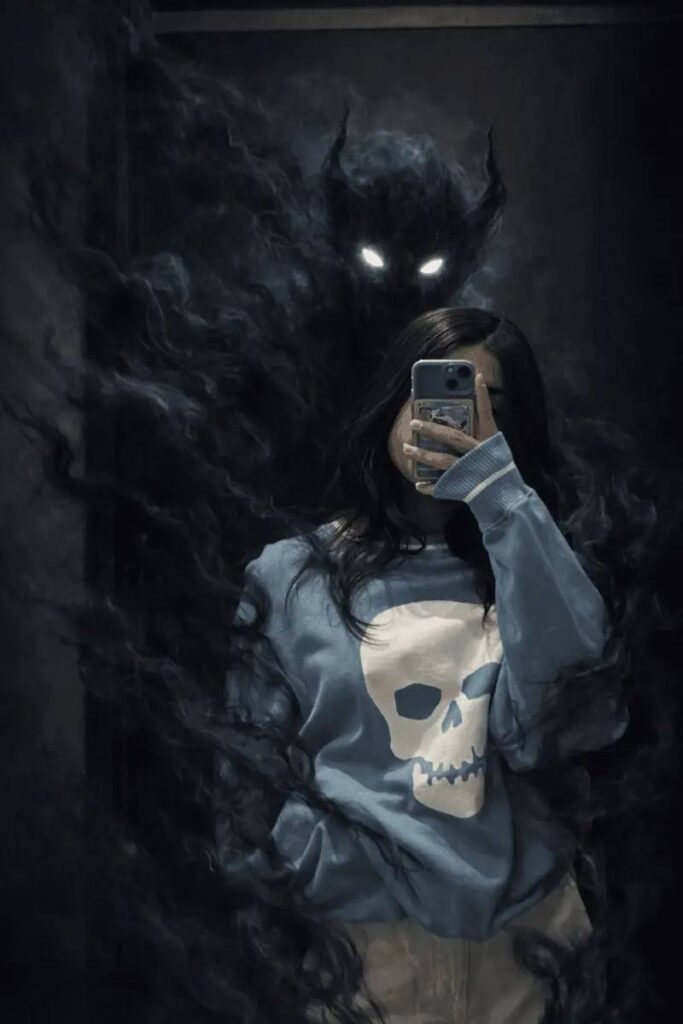 PROMPT:- Transform this mirror selfie into a dark, cinematic fantasy scene. Keep the person exactly the same same face, pose, outfit, lighting, and background. Add a shadowy, smoke-like demonic entity emerging from behind the person’s back. The entity should be made of swirling black smoke, semi-transparent, with glowing white eyes.The smoke wraps around the body and flows down to the floor naturally, blending with the environment.Maintain realistic shadows, reflections, and depth so the creature feels part of the scene. Dark, moody atmosphere, high contrast, cinematic lighting, ultra-realistic, 4K quality.No change to facial features, clothing, or camera angle.